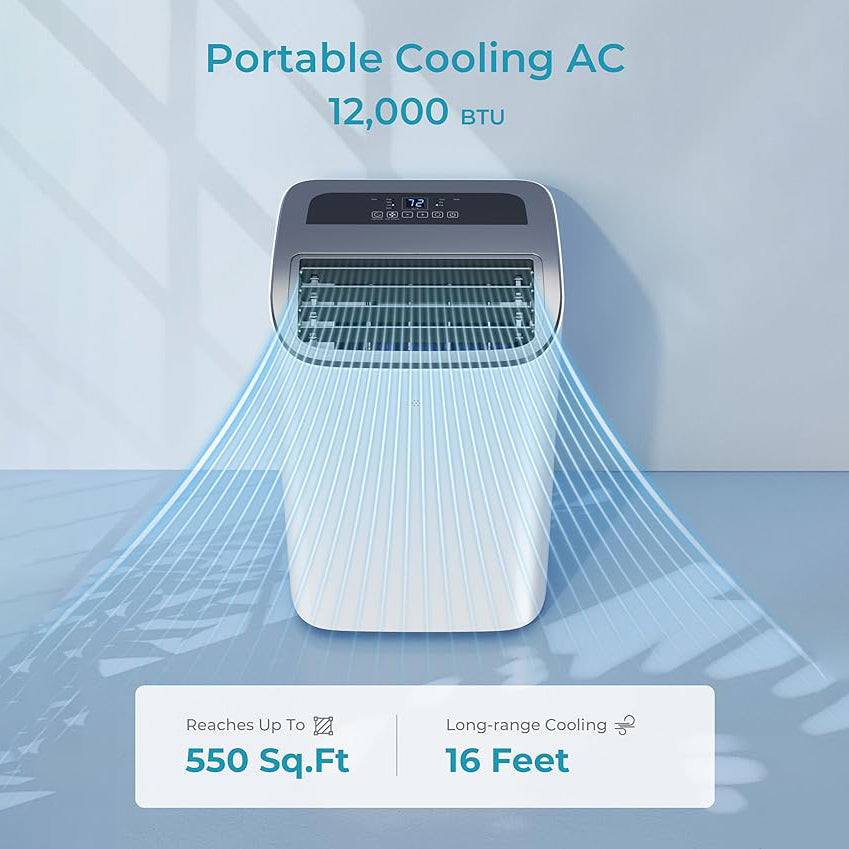 - ❄️【𝐄𝐟𝐟𝐢𝐜𝐢𝐞𝐧𝐭 𝐚𝐧𝐝 𝐏𝐨𝐰𝐞𝐫𝐟𝐮𝐥 𝐂𝐨𝐨𝐥𝐢𝐧𝐠 𝐂𝐚𝐩𝐚𝐜𝐢𝐭𝐲】: This 12,000 BTU portable air conditioner is equipped with an upgraded compressor refrigeration system, and the floor ac unit cooling temperature adjustment range is 61℉-88℉(16-31℃), meeting most of your and your family daily needs. With a maximum wind speed of 400m³/h, this portable AC can provide stable, fast, and efficient cooling for spaces up to 550 square feet, with the lowest noisest level of only 46dB, making it suitable for bedrooms, rooms, apartments, office, etc