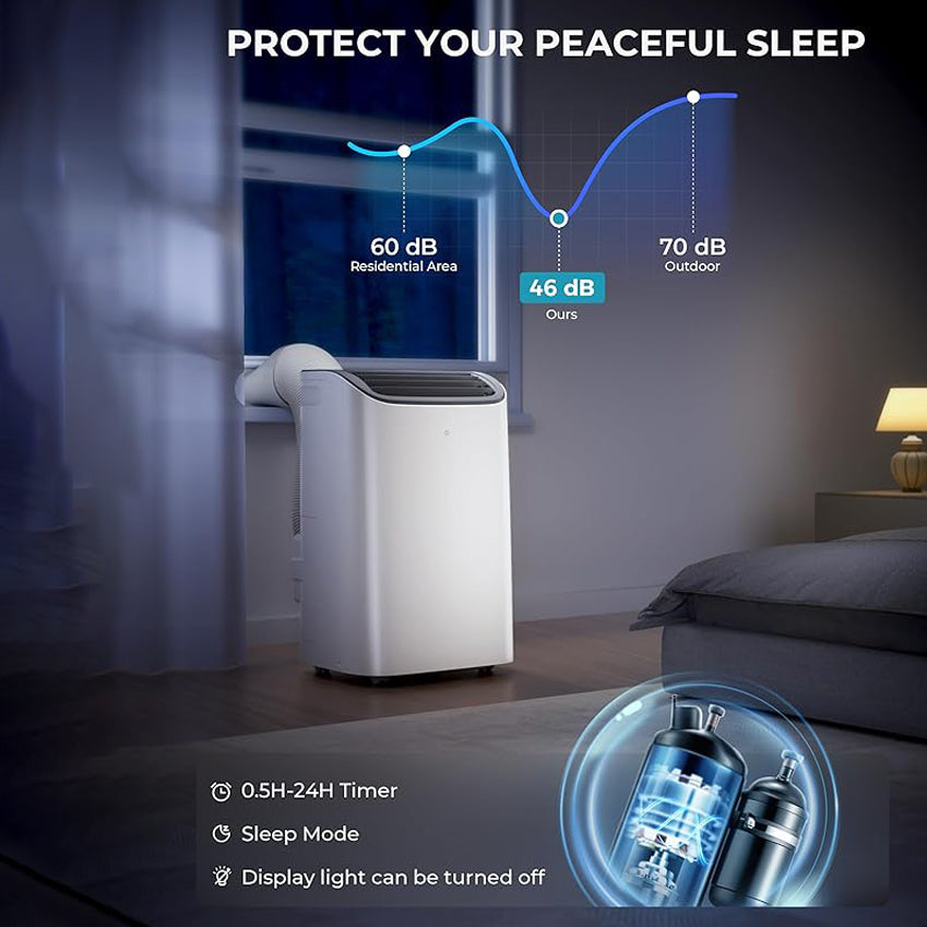 - ❄️【𝐓𝐡𝐞 𝐆𝐮𝐚𝐫𝐚𝐧𝐭𝐞𝐞 𝐎𝐟 𝐀 𝐏𝐞𝐚𝐜𝐞𝐟𝐮𝐥 𝐒𝐥𝐞𝐞𝐩】: In sleep mode, this portable AC unit automatically reduces the fan speed to 48 dB to reduce noise and screen brightness. You can also press the light button to turn off the screen display yourself, helping you have a good sleep. At the same time, this AC unit for the bedroom is equipped with a 24-hour timer, which will automatically shut down when the time you set is reached, saving more energy. You can also turn on the air conditioner's automatic swing function for a more comfortable experience