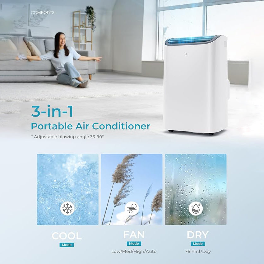 - ❄️【𝟑-𝐈𝐧-𝟏 𝐀𝐢𝐫 𝐂𝐨𝐧𝐝𝐢𝐭𝐢𝐨𝐧𝐞𝐫 𝐏𝐨𝐫𝐭𝐚𝐛𝐥𝐞】: The room air conditioner has cooling, dry, sleep, and fan function modes. In cooling and fan mode, the wind speed can be adjusted to Low, Medium, or High three fan speeds. It is also equipped with an auto swing function, which allows you to adjust settings to your preference and enjoy optimum comfort. When switched to Dry mode, the room AC can remove 76 pints of moisture per day, and it can be automatically drained by simply installing the drain pipe to the drain port, and you can use it as a dehumidifier. Indulge in the customized cooling you deserve with our floor air conditioner portable for room